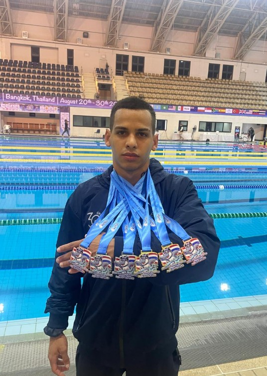 O nadador @adenilson_tubarao , atleta da Associação Esporte+, encerrou sua participação no Campeonato Mundial de Natação Virtus 2025, realizado no Centro Aquático da Universidade Assumption, na Tailândia, com um desempenho histórico: foram seis medalhas no total, sendo duas de ouro, duas de prata e duas de bronze.